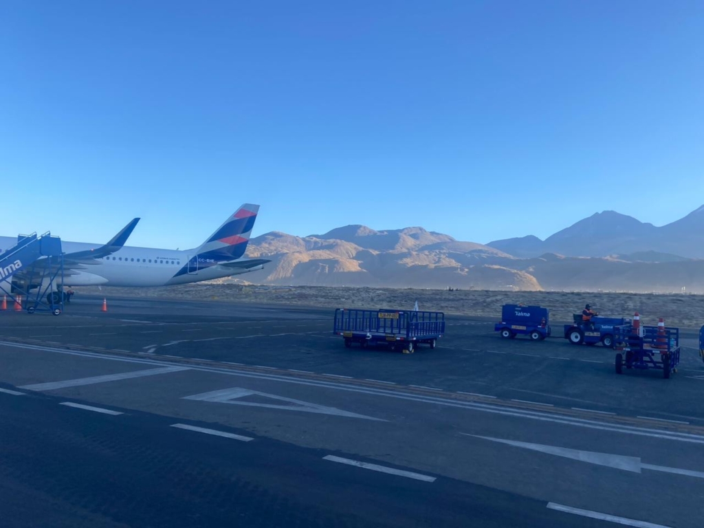 La imagen muestra una vista del aeropuerto de Arequipa con vehículos de transporte de equipaje y personal de tierra trabajando en la plataforma, bajo un cielo parcialmente nublado.
