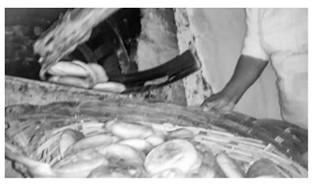 • El hornero retira los panes del horno con el jalacho y otro maestro en panificación recibe estos panes en un balay para luego ser depositado en canastas ambos elementos tejidos con ramas de tanquish y chilca.