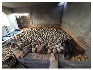 • El proceso del horneado inicia con el calentamiento del horno artesanal, se ubican los leños de eucalipto en la parte central del horno artesanal y se prende el fuego, la duración de este procedimiento es de una a dos horas aproximadamente. El color blanco en los muros y piso del horno es una señal de que está listo. La temperatura alcanzada aproximadamente está entre 350 °C y 450 °C.