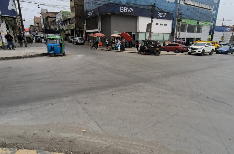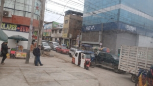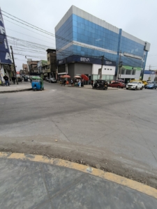 Lugar externo desordenado, polvoriento..hay mucho tráfico. Siendo a media mañana.