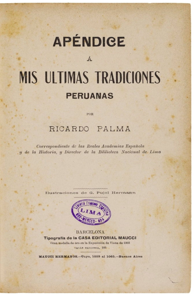 - El libro aparece como una obra complementaria al volumen Mis últimas tradiciones peruanas, actuando como una suerte de suplemento o apéndice.