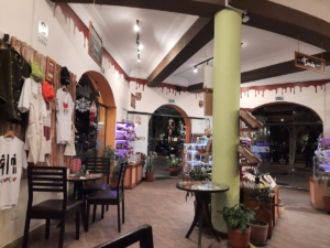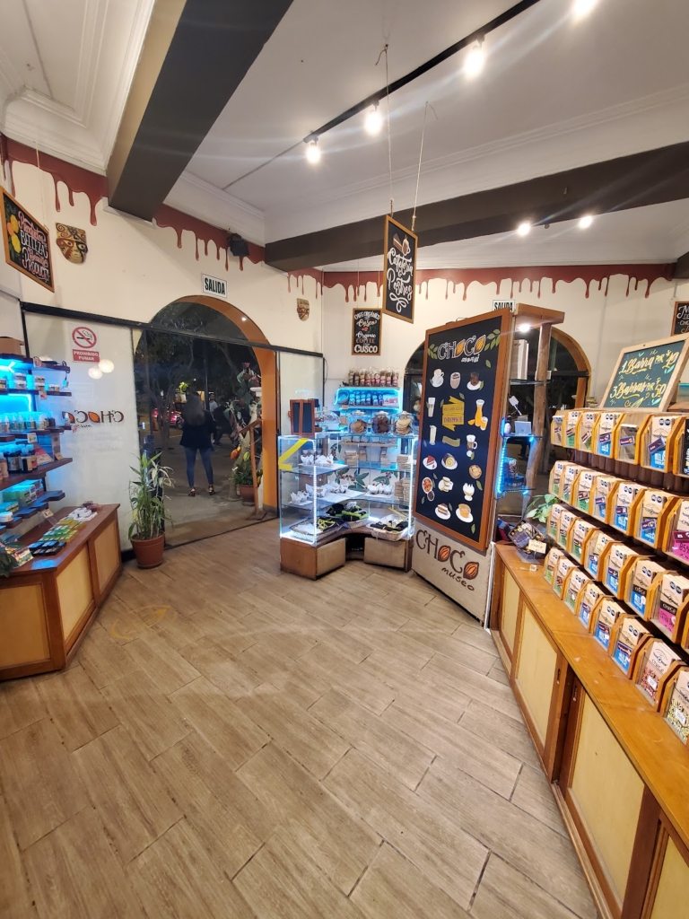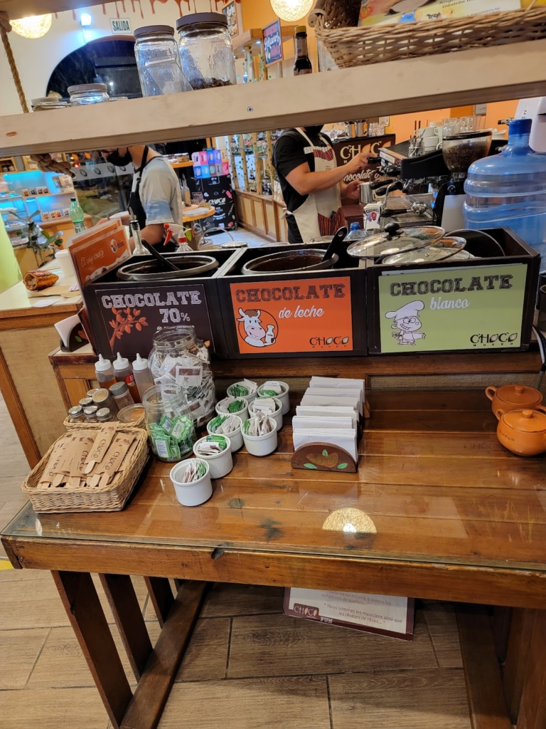 Entré al choco museo sin saber que lo era, ya dentro una chica muy amable me explicó que lo era y nos ofreció muestras gratis, así que decidí sentarme a tomar una bebida caliente. Tienen varias variedades de bebidas a base de chocolate y para acompañar muchos postres. Una de las cosas que me gustaron fue que en las sillas hay unas mantas coloridas «chocomanta» con las que uno puede abrigarse si hace frío. Todo estaba rico.