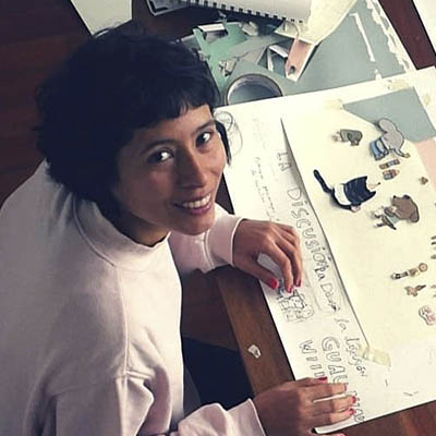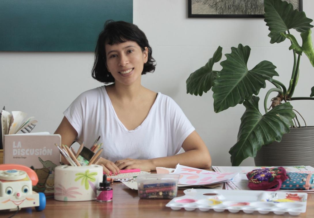La artista sonríe mientras trabaja mesa llena de colores, pinceles un libro titulado "La Discusión", mostrando pasión por el dibujo.