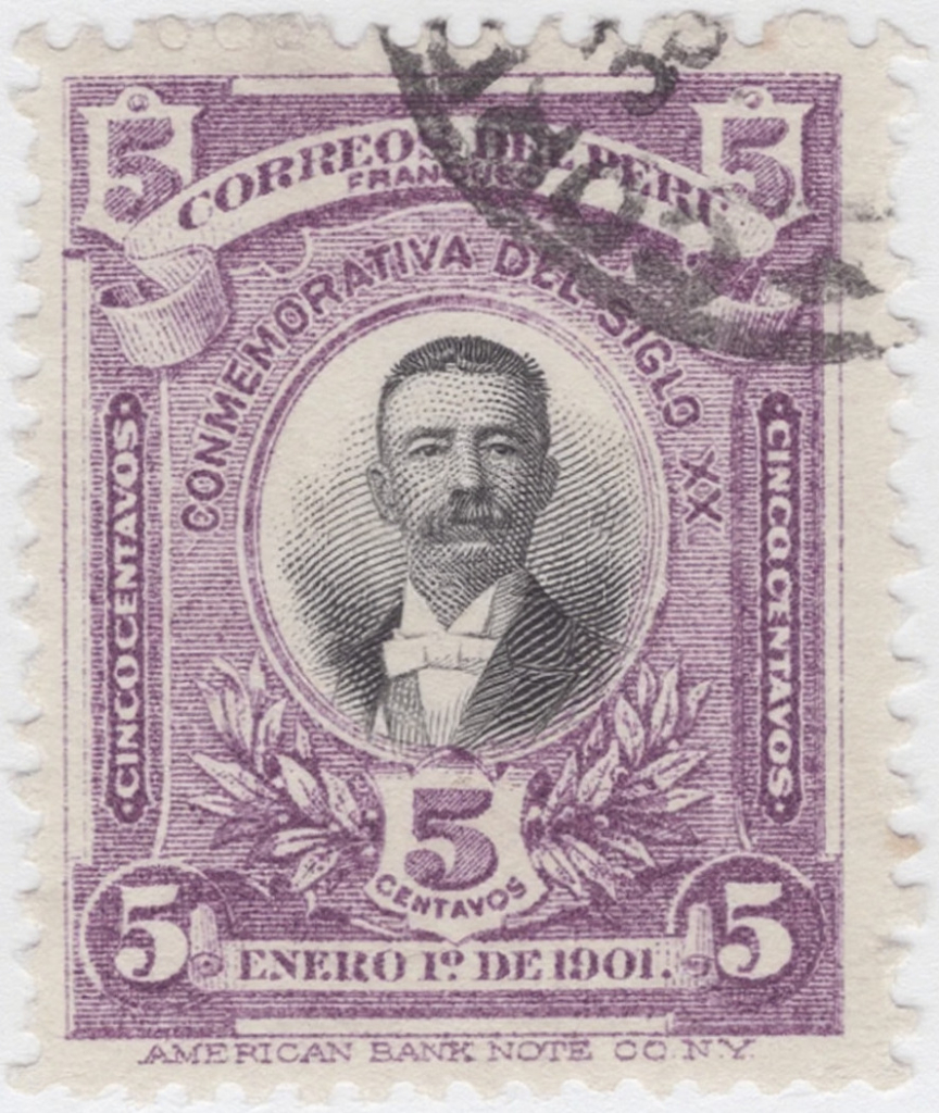 Emisión postal peruana de 5 centavos, puesta en circulación el 1 de enero de 1901, impresa por la American Bank Note Company (N.Y.). Conmemora el inicio del siglo XX y presenta el retrato del entonces presidente Eduardo López de Romaña. Impreso en tono violeta.