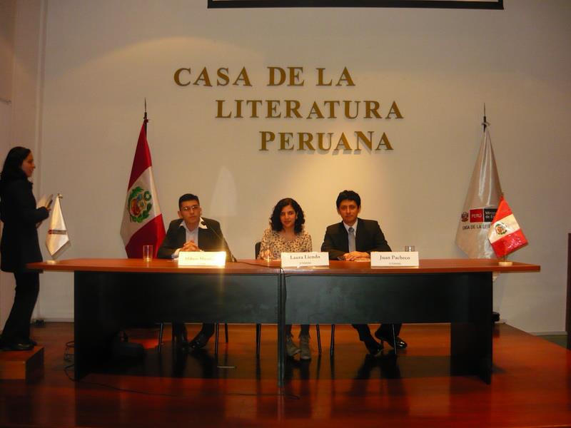 En Peruana, tres oradores se preparan para una sentados a mesa, cada uno con un micrófono frente a ellos.