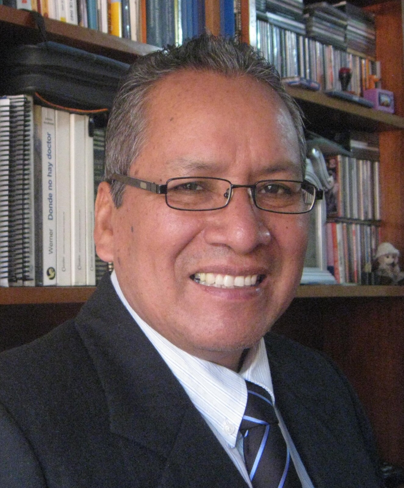 Sonriendo frente a la cámara, viste un traje oscuro y una franjas azules, posando frente a una estantería repleta libros.