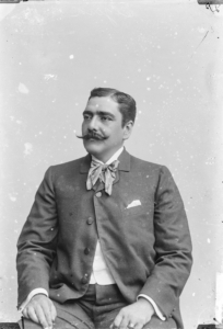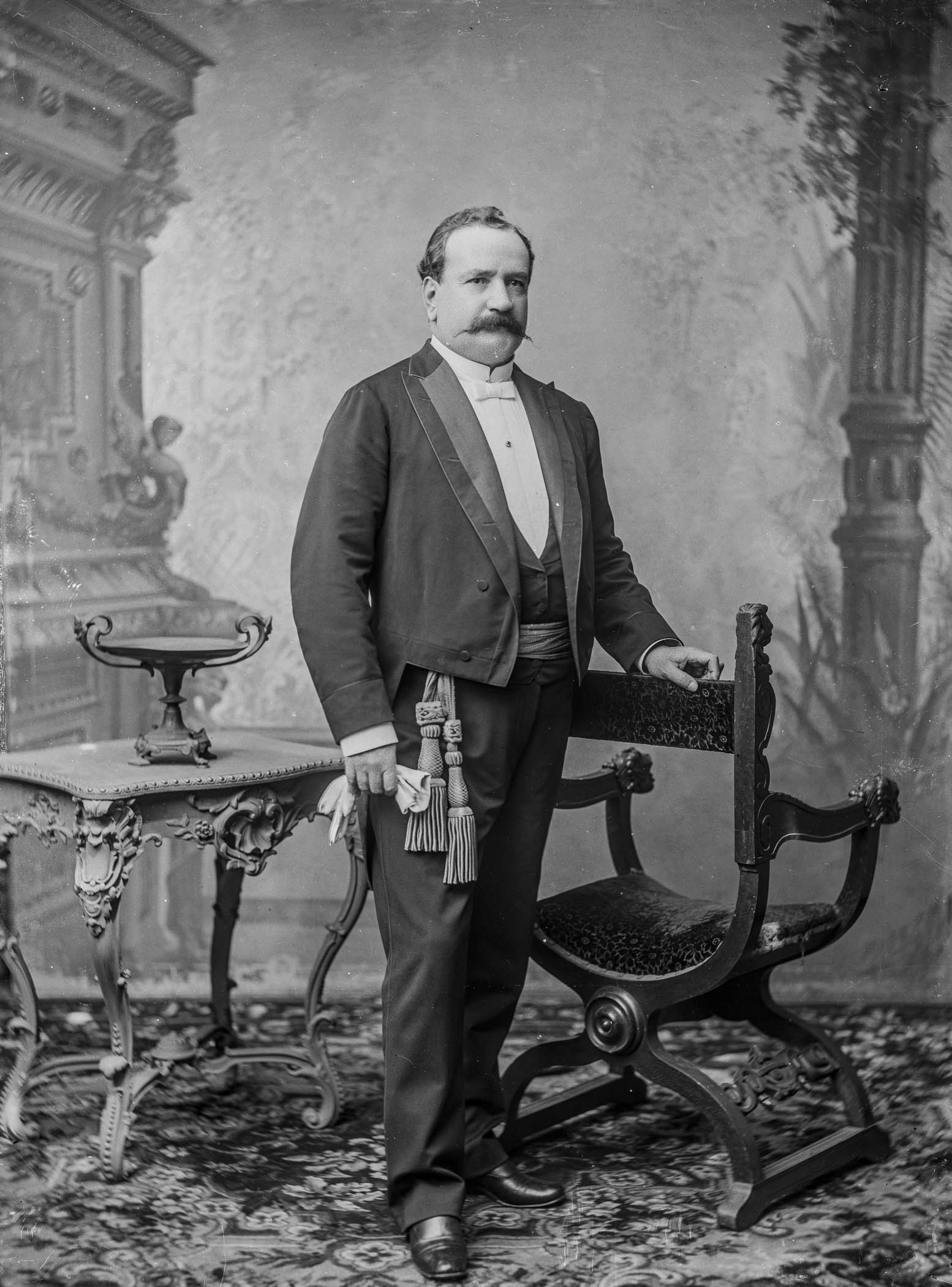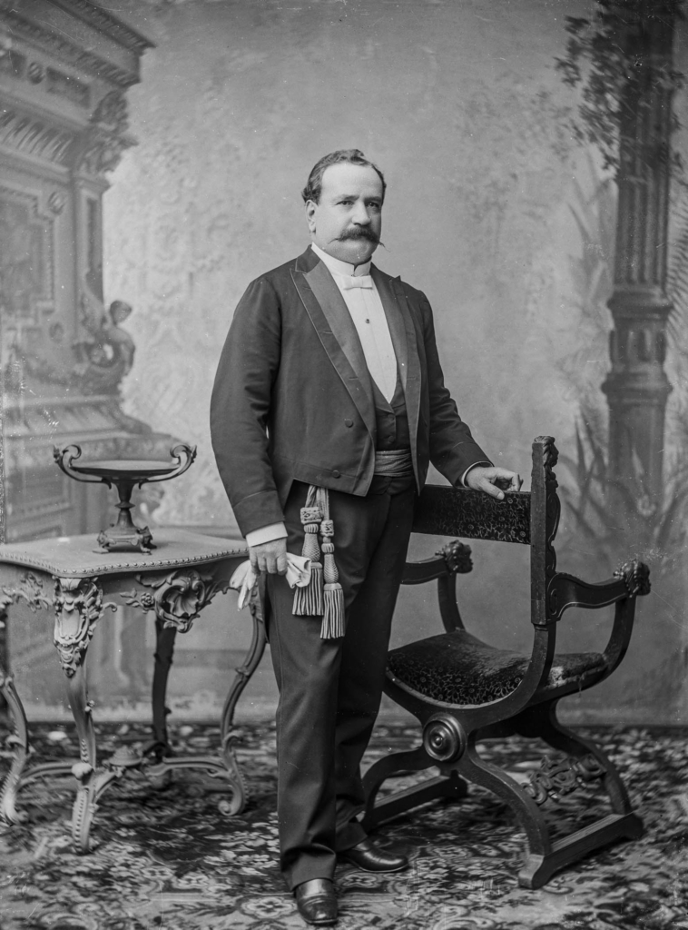 El mandatario luce una banda presidencial con un patrón de ondas distintivo, además de un uniforme con adornos elaborados en los hombros. Remigio Morales Bermúdez circa 1890.
