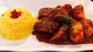Un plato blanco presenta chicharrón colorado de Sapallanga, acompañado de arroz amarillo con una flor morada encima; el guiso tiene trozos de carne y papa en salsa roja oscura, espolvoreado con hierbas verdes.