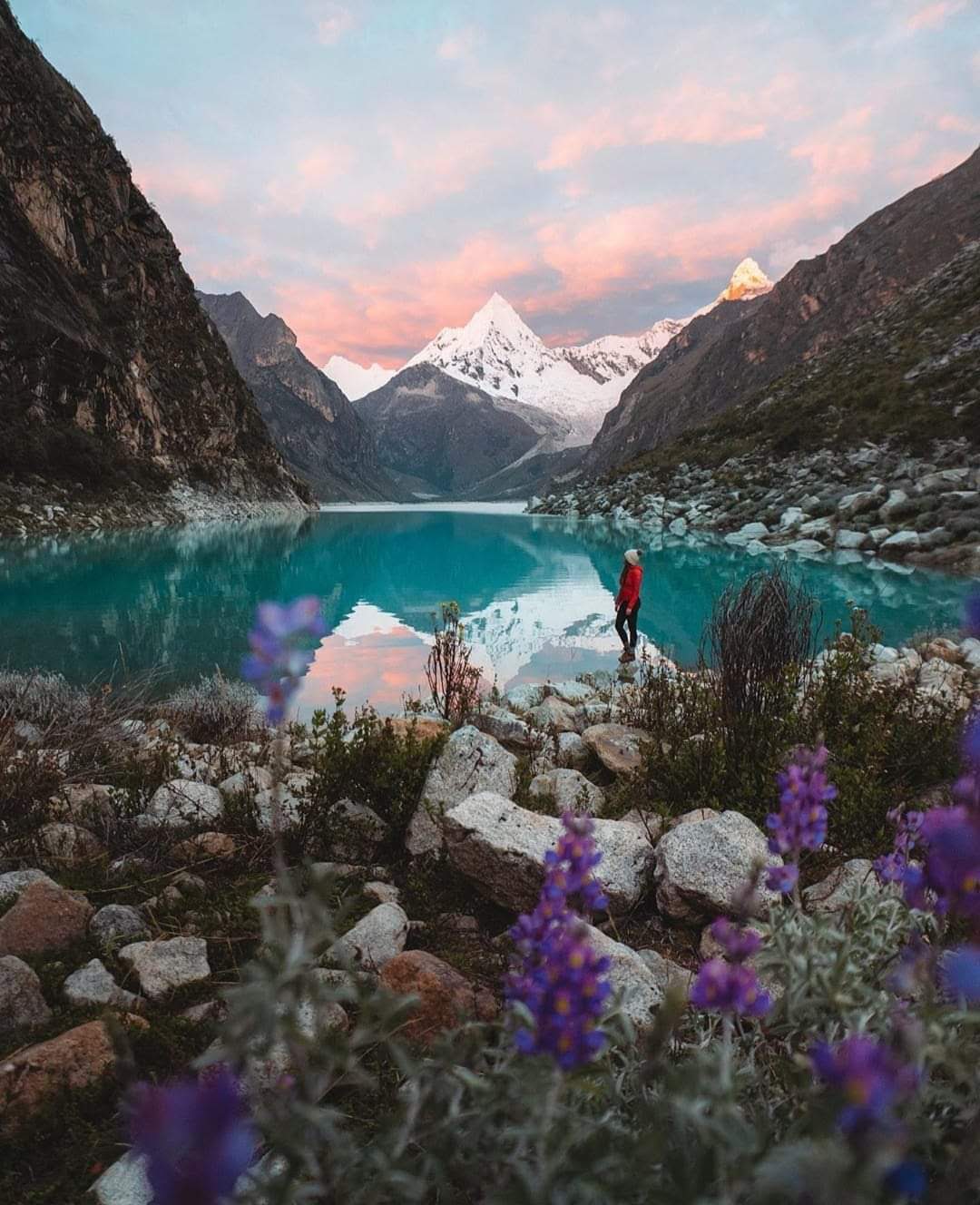 Un lago de color turquesa refleja las montañas nevadas en el Parque Nacional Huascarán, con flores silvestres en primer plano.