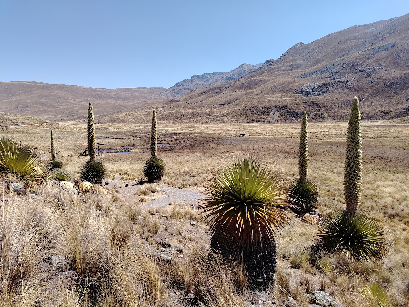 - Puya Raimondi, gigante de hasta 12 m que florece una sola vez en su vida (80–100 años).