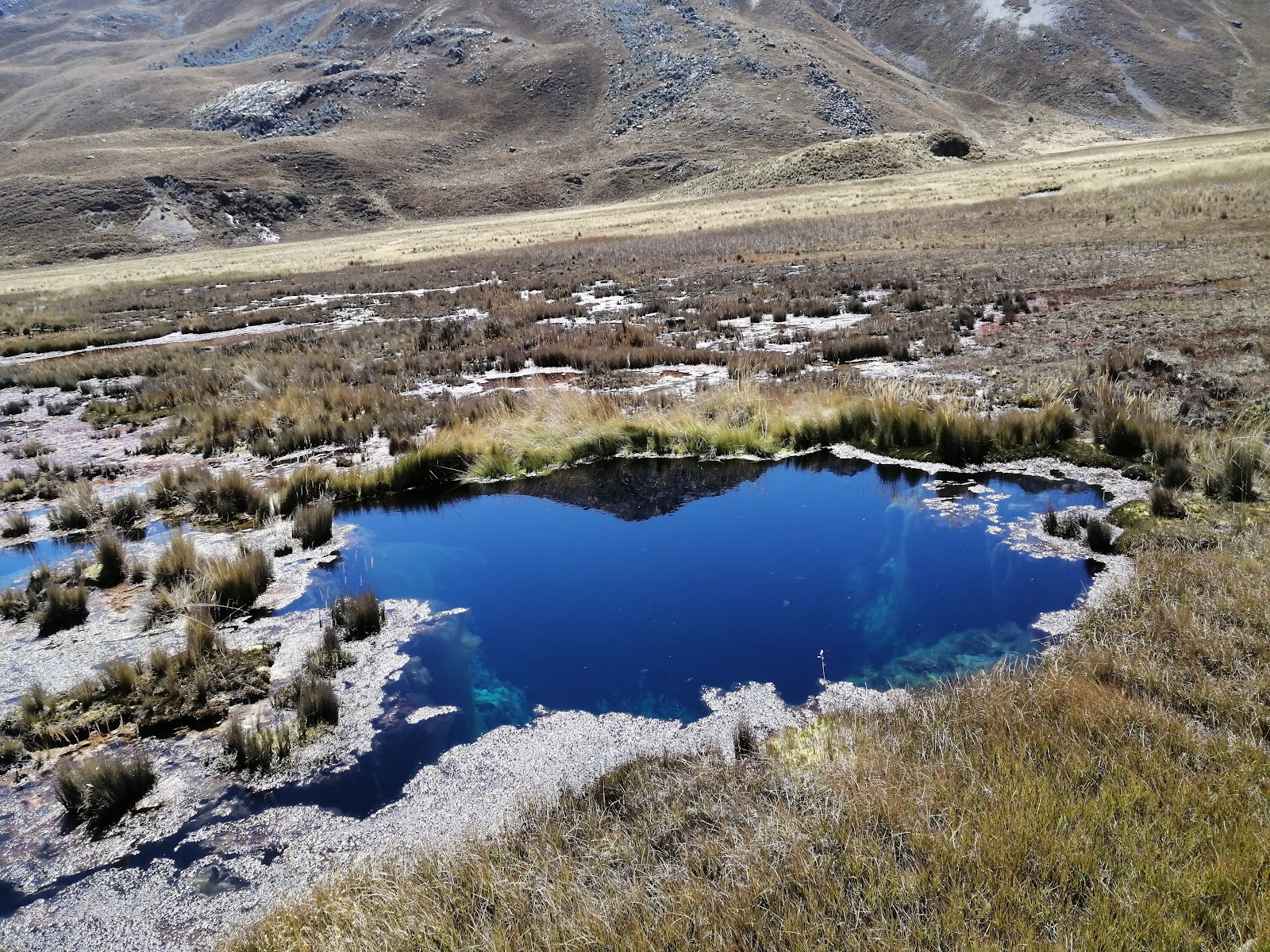 El agua cristalina refleja el paisaje montañoso en el Parque Nacional Huascarán, creando una imagen serena y cautivadora para el visitante.
