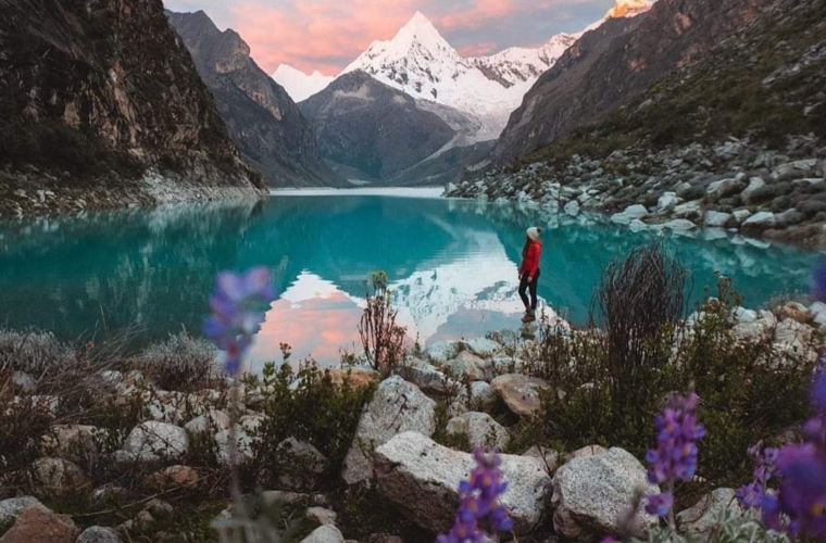 Un lago de color turquesa refleja las montañas nevadas en el Parque Nacional Huascarán, con flores silvestres en primer plano.